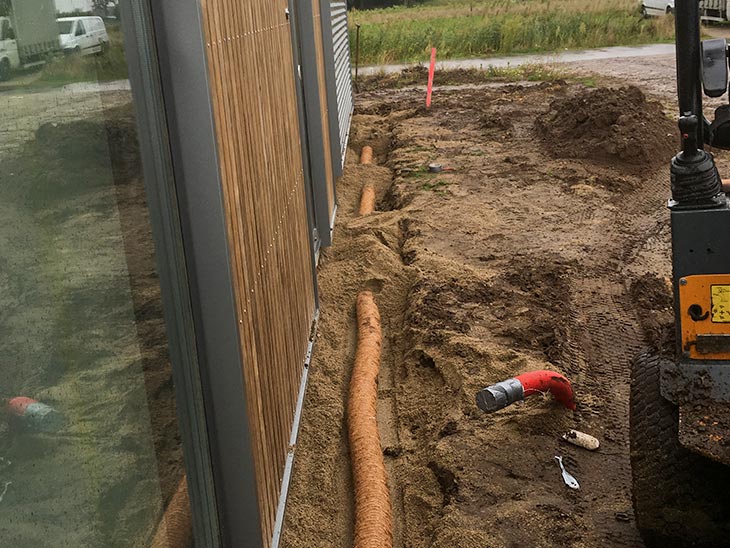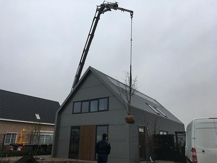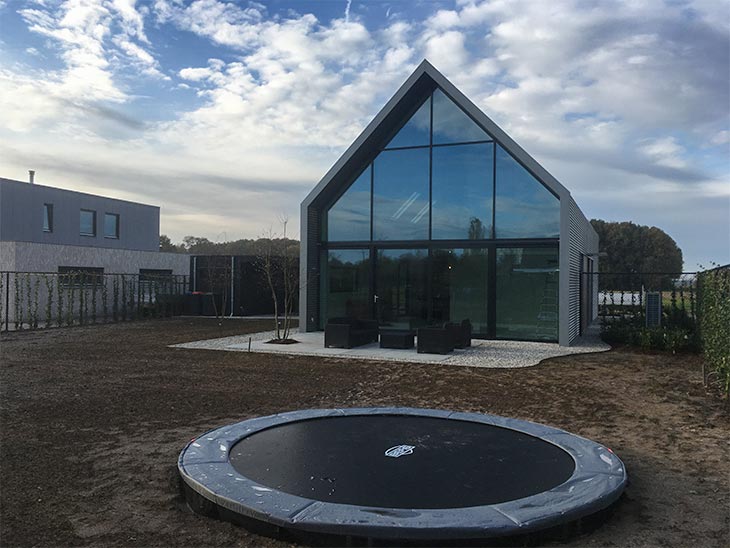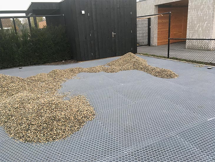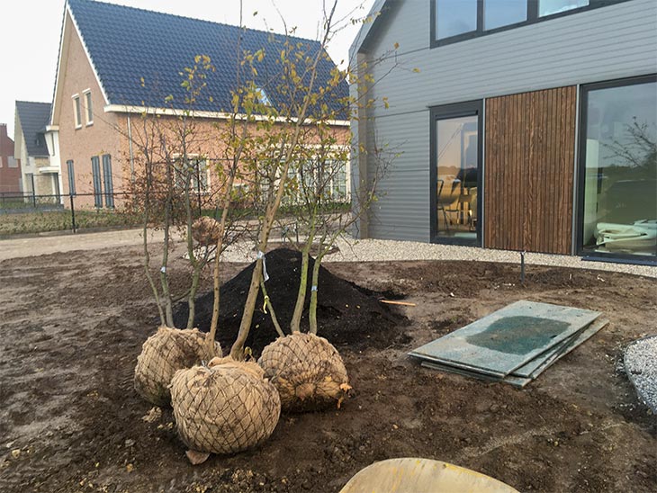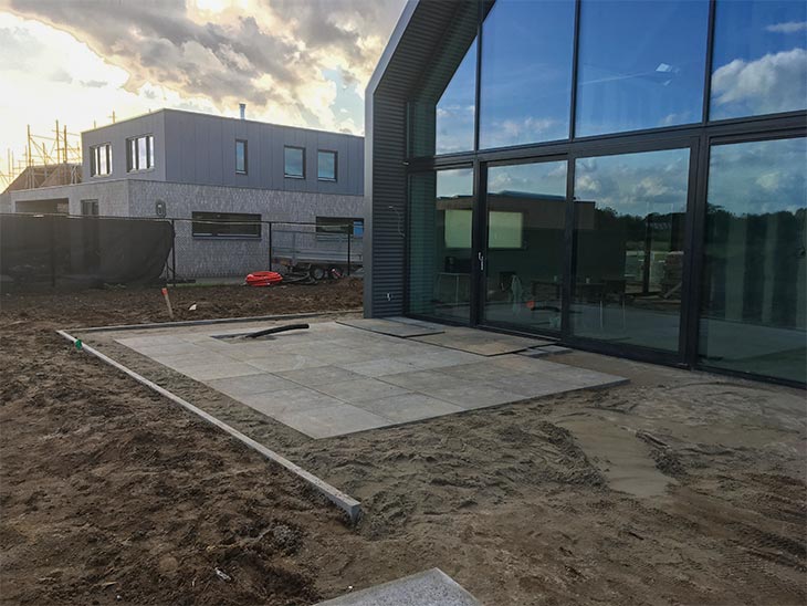 Na voorbereidingen van het grondwerk, waaronder ingraven van leidingen, is er gestart met het leggen van het straatwerk, het plaatsen van grindplaten en het grind. Het ingraven van de trampoline en plaatsen van bomen en beplanting.